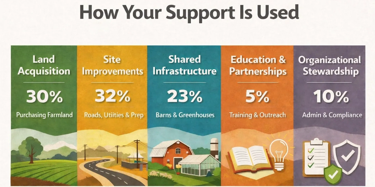 As the project progresses, funds will support the development of shared resources—such as barns, greenhouses, and essential systems—along with the legal, financial, and organizational stewardship required to manage land responsibly, support residents, and remain accountable to donors and partners.