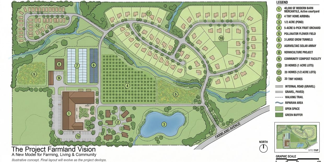 Project Farmland is designed for people who want meaningful work with the land while remaining connected to modern life. Residents may work traditional jobs, build small businesses, or pursue creative paths—without moving far from schools, services, or community.